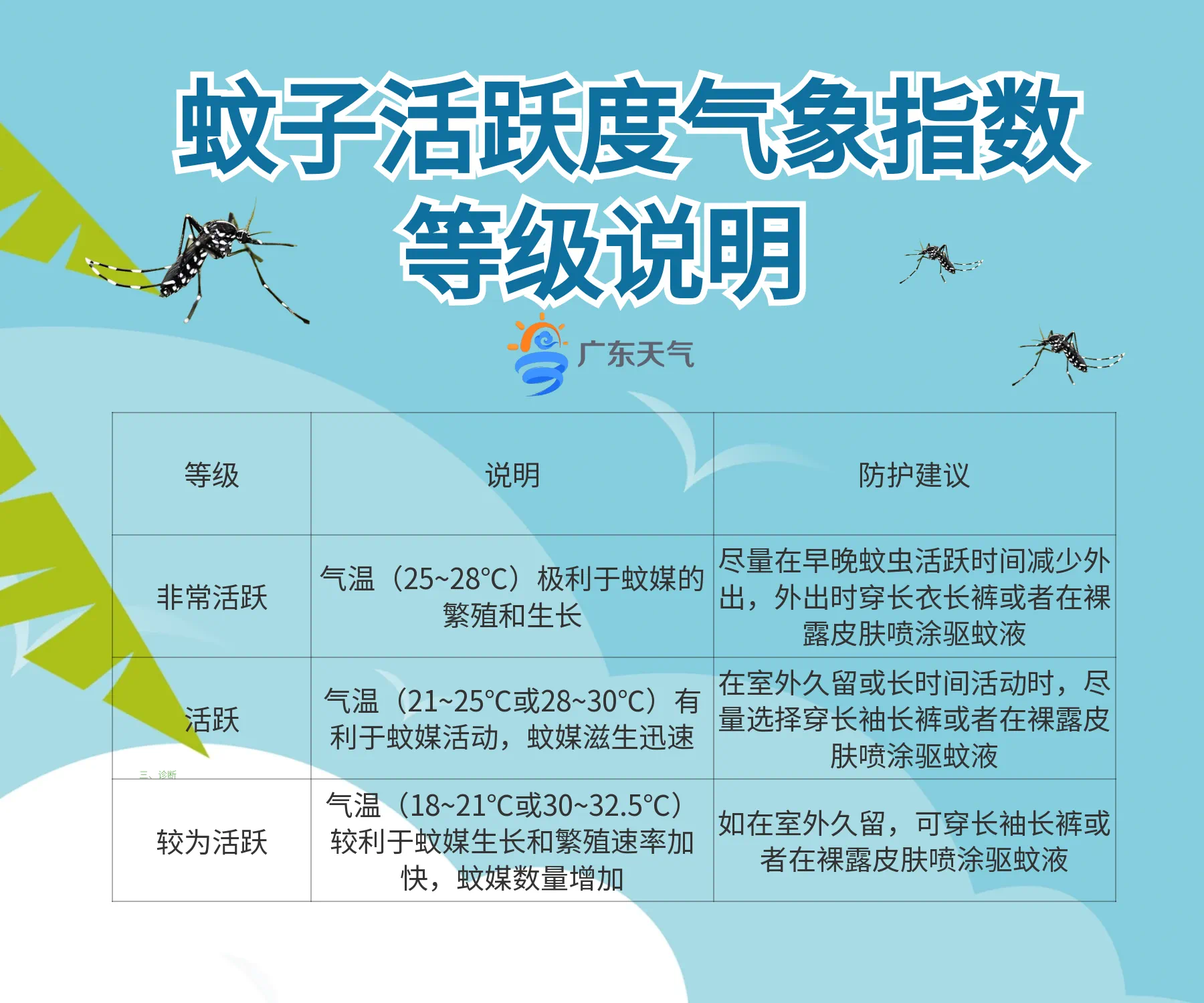 健康提示:最近基孔肯雅热多发,请公众要积极行动起来,及时清理家中及周边积水,安装纱门纱窗或使用蚊帐。气温变化影响蚊子活跃度,尤其在日出后2小时及日落前2小时为伊蚊活动高峰,请市民朋友做好防护措施,谨防蚊虫侵扰。